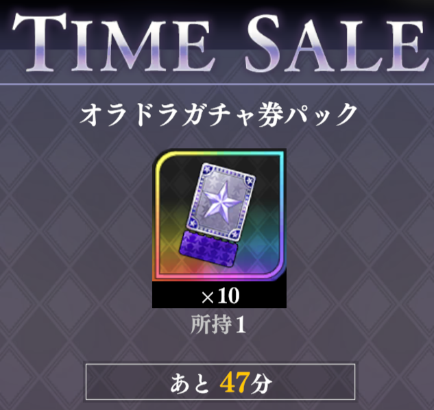 1時間限定とかいっちょまえにつけてますが全くおすすめできません。オラドラガチャ券はただの常設ガチャの券です。現時点ではURユニットは恒常しかいないため、どのガチャも内容には大きな差はありませんが、新キャラが追加された時にこのガチャに追加されない可能性があります。限定キャラも来ると考えられるのでなおさらです。というかこのチケット、上にあげたパスを買ったり、ミッションをこなしてるだけでも普通に手に入ります。貴重な有償石500でこれは…おとなしくパスを買いましょう。