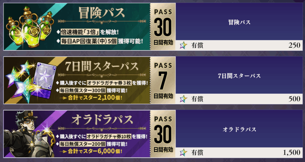 ということで「オラドラパス」とか言うたいそうな名前のわりに勝利したのは7日パスとなりました。ガチャ券の差も石換算の差150でなくなっているし、むしろ恒常ガチャ券なんていらないものよりいろんな場所で使える石の方が圧倒的に良いです。