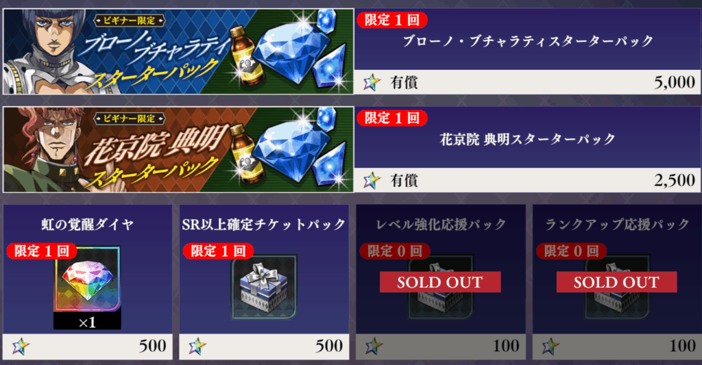 お勧めしません。花京院の方ですが有償石2500とは5000円ということであり、それで手に入るのはSRの花京院一体と少量の覚醒石・ダイヤ、金ドリンク100。こんなものでは当然育成もままならないし、有償石ガチャやパスのほうが圧倒的にお得です。ブチャラティの方も同様で有償石5000=1万円でURブチャラティ一体とほかの内容は花京院の方とほぼ一緒です。はっきり言って価値だけで言えば絶対に買うなと言いたいところですが、ブチャラティや花京院が好きな人からすれば「確実に推しを入手できるパック」であり、そういう意味では特定の人にとっては最高に価値のあるものにもなりうるでしょうか。