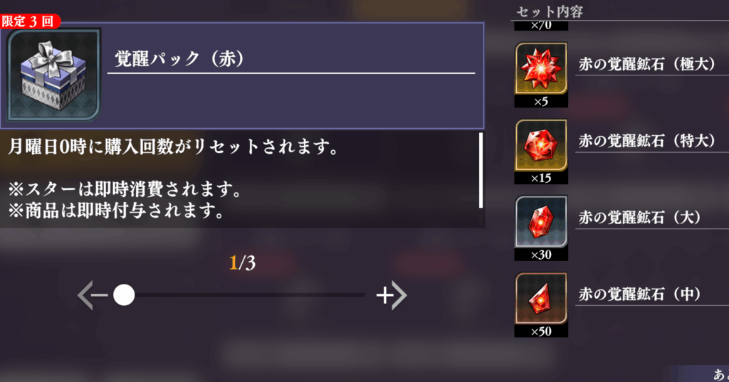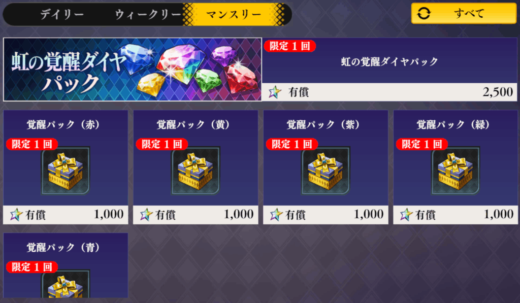 です。一見石が1300でそこまで…のように思えますが、絶賛不足中であろう強化素材、石換算450のガチャ券、貴重な虹ダイヤ等を考えるとかなりお得と言えるのではないでしょうか。有償ガチャやパスほどのインパクトはありません(手間や時間でどうにかなる部分も多い)が、石換算すれば結構なもの。購入はおすすめできます。7日パスでも有償石500では石2100+券3枚。大量の+α分を考えれば全然悪くない選択肢だと思います。特に虹の覚醒ダイヤなんかは無償石500相当で入手手段も限られているのでこれが貰えるのはデカいです。