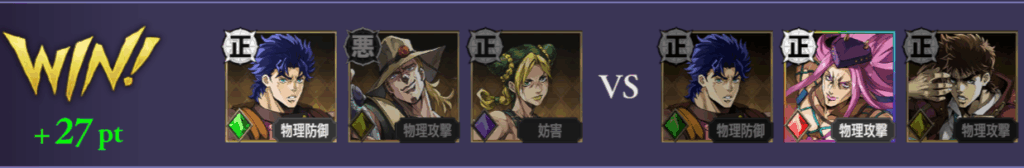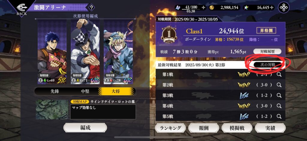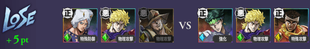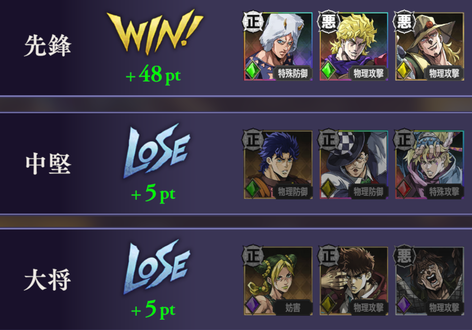 上の画像を見てわかるように勝利するとたくさんポイントが貰え、敗北するとかすみてぇなポイントが貰えます。つまり、3戦中2戦取るより完勝した方が多くポイントが貰えるわけですね。当たり前っちゃ当たり前ですが「ぼくは一番が好きだナンバー1だ!誰だろうとぼくの前でイバらせはしないッ!」っていうディオみたいな人は意識しておきましょう。