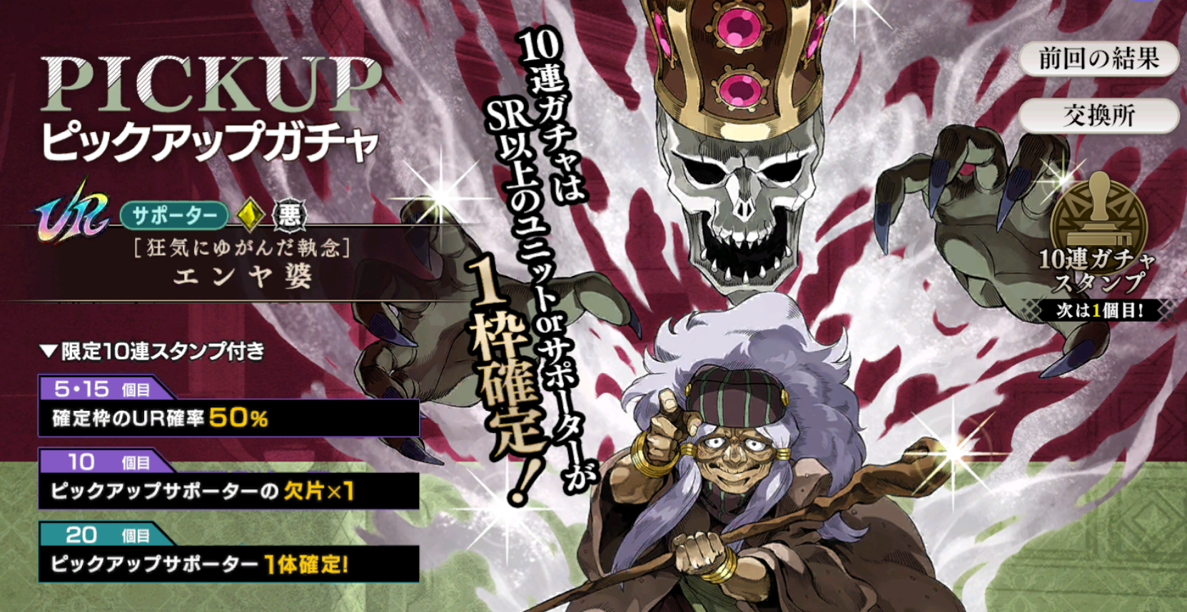 基本的には前回のDIOのガチャと同じですがスタンプ10連目の報酬が異なっており、